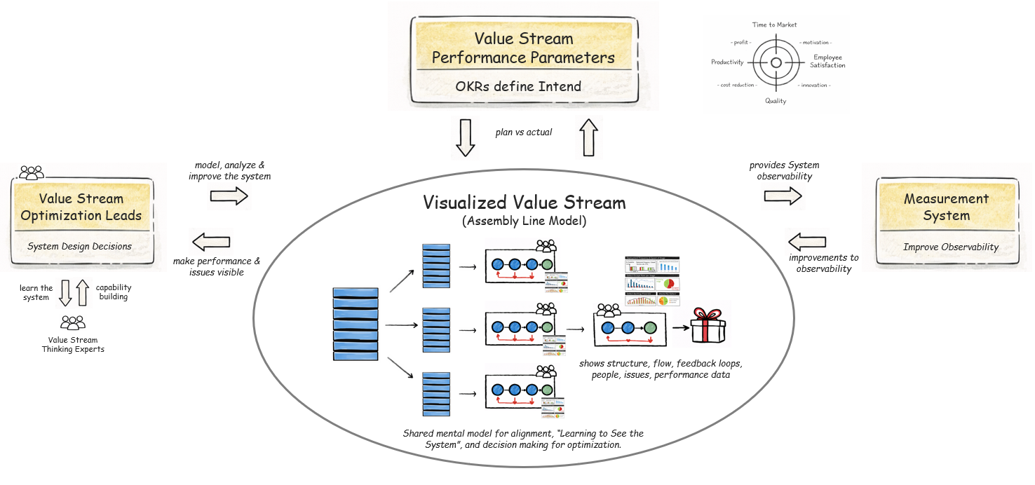 This diagram shows value stream optimization as a system2, not a sequence of activities. Each major entity plays a distinct role, and improvement emerges from their interaction.