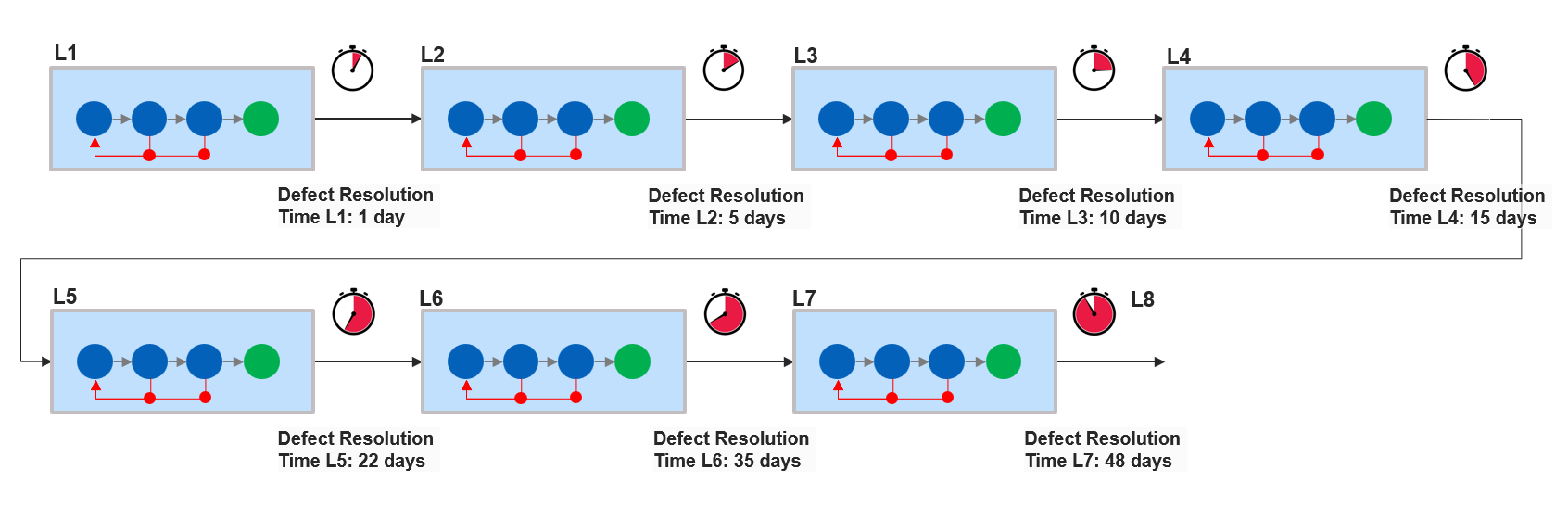 The second illustration shows what happens once multiple components are integrated into a higher-level subsystem or integration stage (L2). At this point, Defect Resolution Time becomes a composite measure. The integration stage has its own average resolution time, but that average masks significant variation across the contributing components.