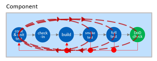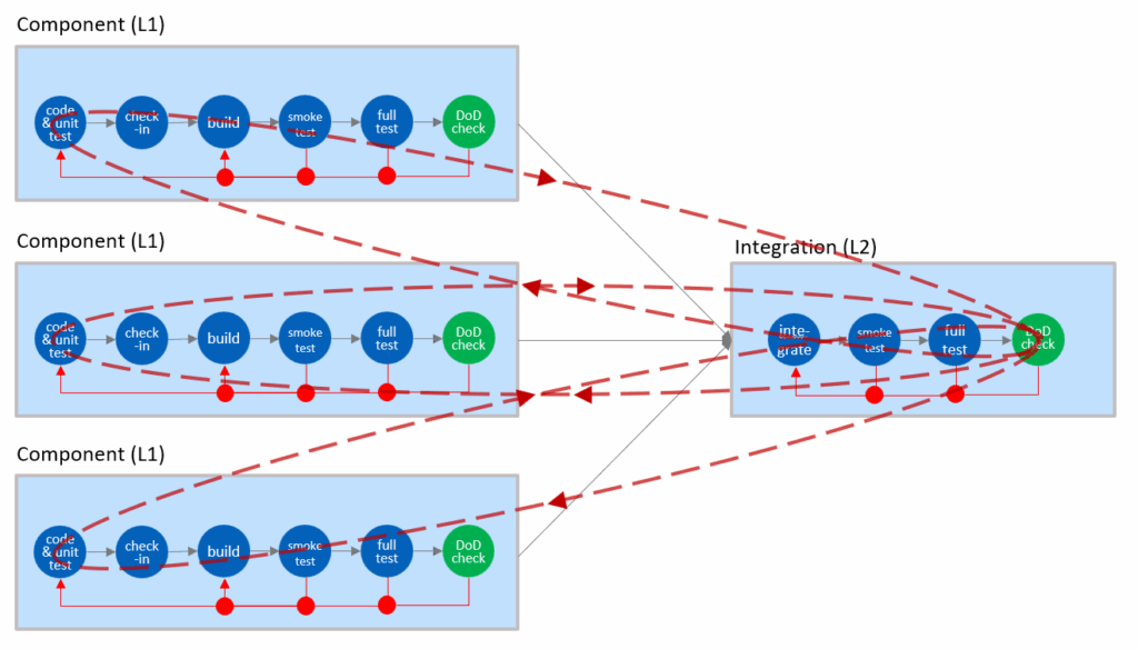 As components grow in size or responsibility, and as more people become involved, these feedback loops naturally expand. Even at the component level, additional test stages and hand-offs increase resolution time, but ownership usually remains relatively clear and coordination manageable.
