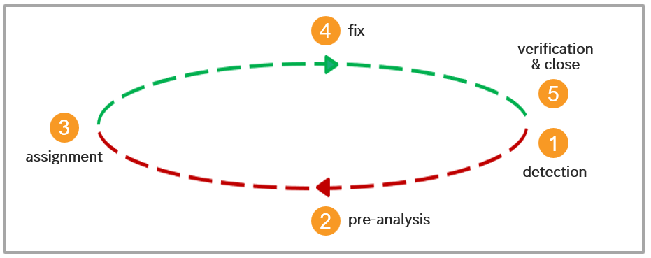 Together, these phases describe the end-to-end defect resolution flow, including triage, assignment, root-cause analysis, implementation, integration, verification, and closure.
