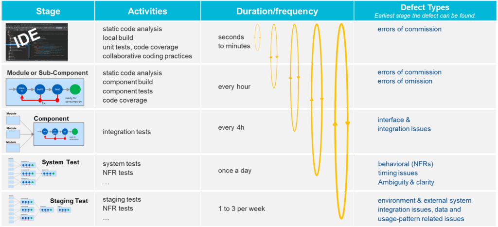 To understand the economics of early defect detection, it is essential to examine the different stages along the development and testing value stream. Each stage provides feedback – but feedback differs dramatically in speed, cost, and reliability.