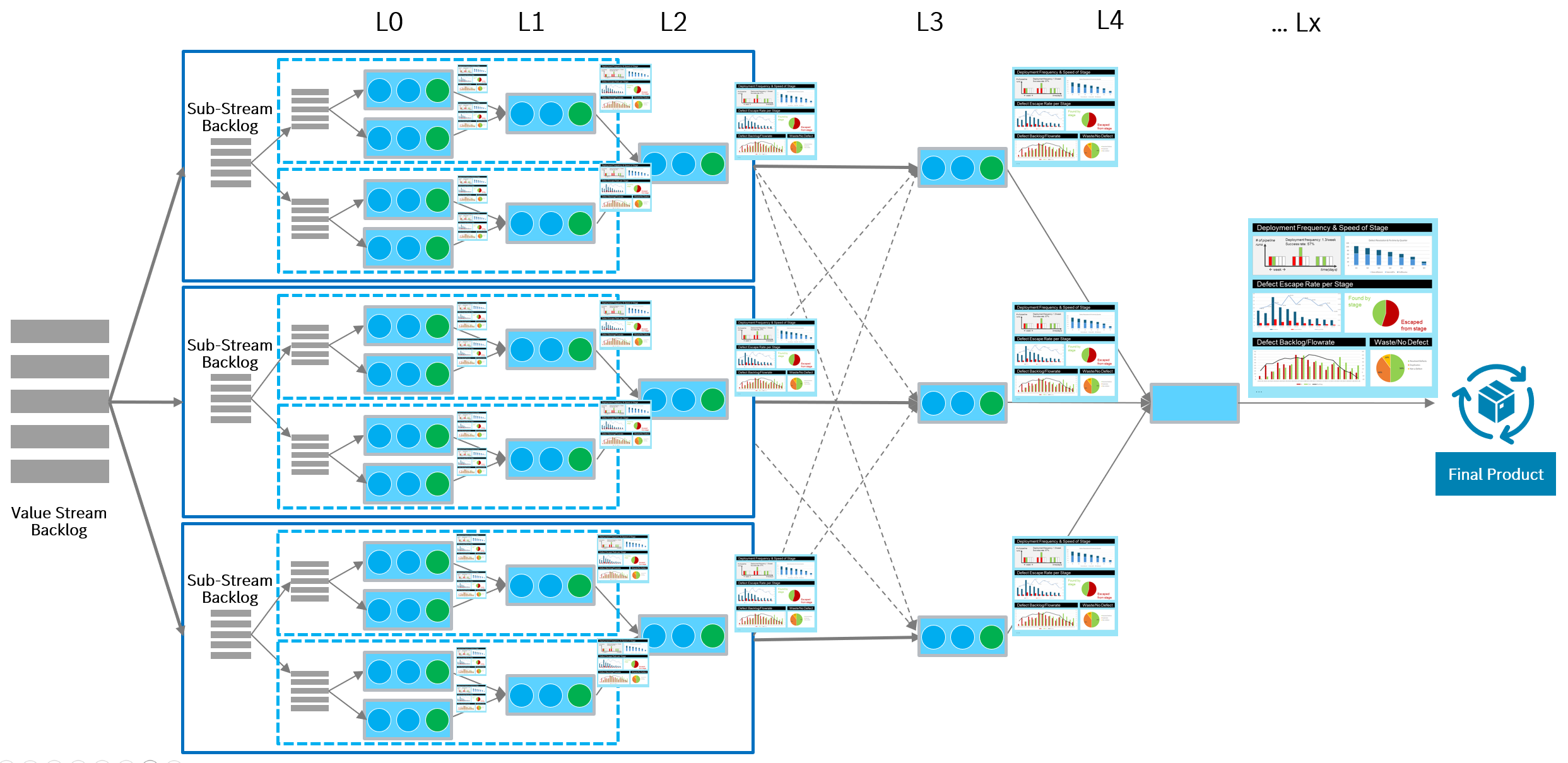 - At the value-stream level, they summarize overall flow performance and support outcome-oriented steering.