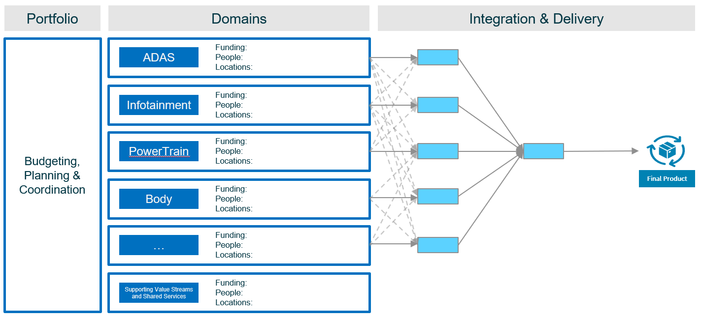 Domain Value Streams are not merely internal building blocks of vehicle development. Each domain delivers its sub-products to multiple model series – often in parallel – serving different vehicle lines, programs, markets, and timelines.