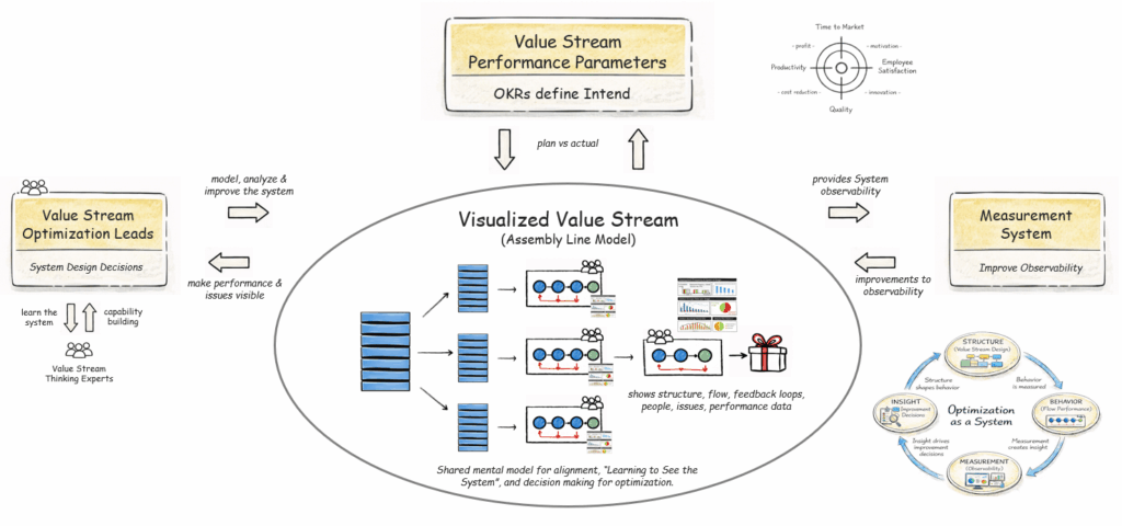 OKRs define intent and set the direction for optimization. The visualized value stream or landscape (Assembly Line Model) then makes structure and flow explicit as one integrated system. A supporting measurement system provides observability, allowing behavior to be understood rather than assumed.