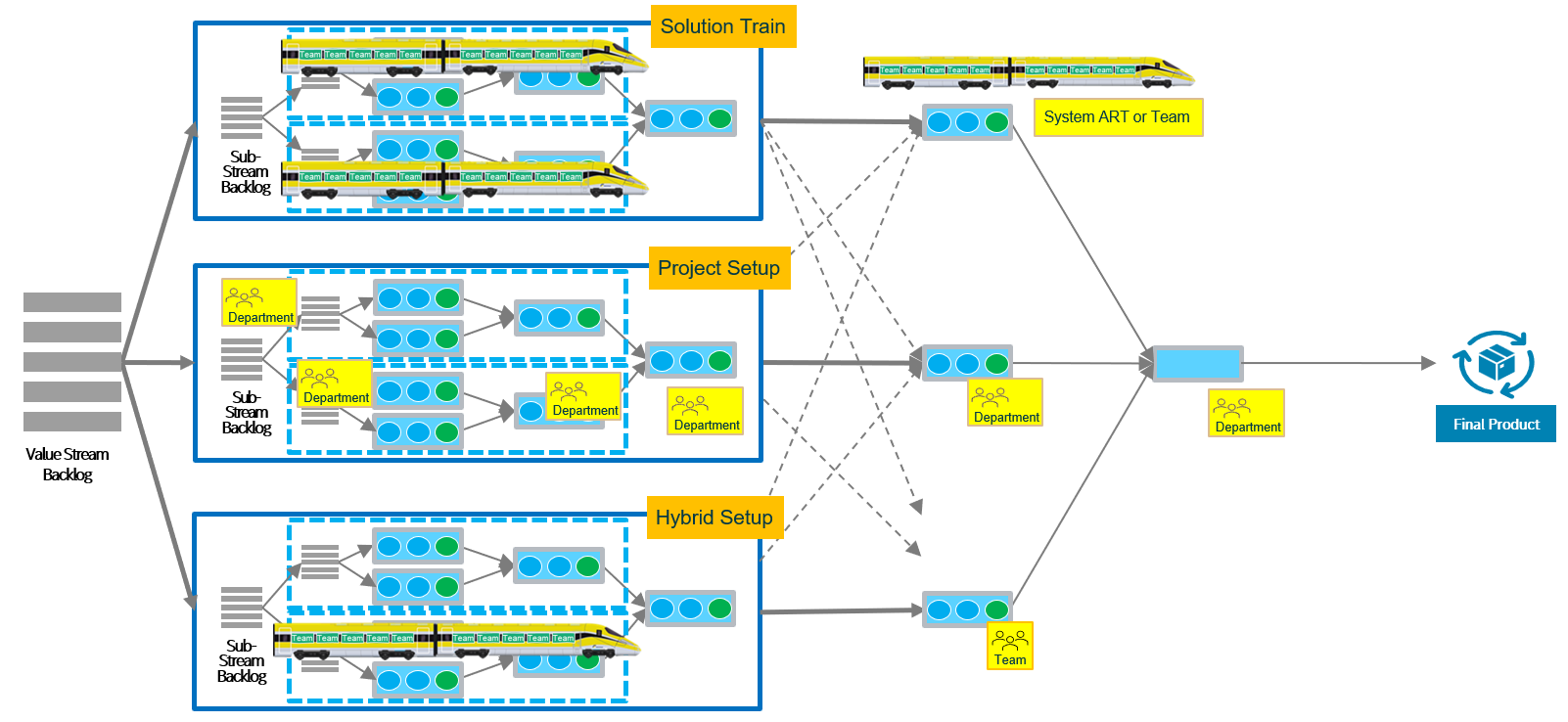 Internally, however, the implementation of a Domain Value Stream can vary significantly. In an idealized case, a single coherent, product-oriented flow delivers all required variants of the domain sub-product. At the other extreme, variants or generations may be realized through separate, project-like flows – effectively creating parallel sub-streams with limited integration. Components may be shared or duplicated. Some elements may be developed internally, others heavily supplier-driven.