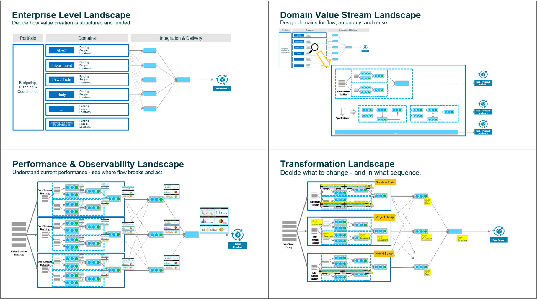 Value Stream Landscapes provide these lenses. The Enterprise-Level Landscape clarifies structural and governance foundations. The Domain Value Stream Landscape reveals how internal architecture shapes flow and autonomy. The Performance & Observability Landscape turns structure into observable system behavior. The Transformation Landscape adds a time dimension, making evolution, future states, and sequencing visible.
