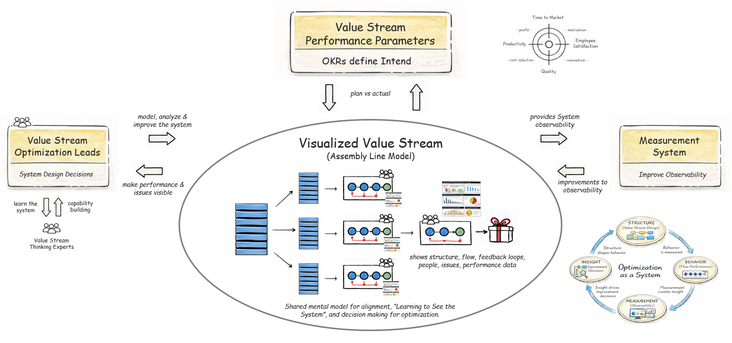 OKRs define intent and set the direction for optimization. The visualized value stream or landscape (Assembly Line Model) then makes structure and flow explicit as one integrated system. A supporting measurement system provides observability, allowing behavior to be understood rather than assumed.