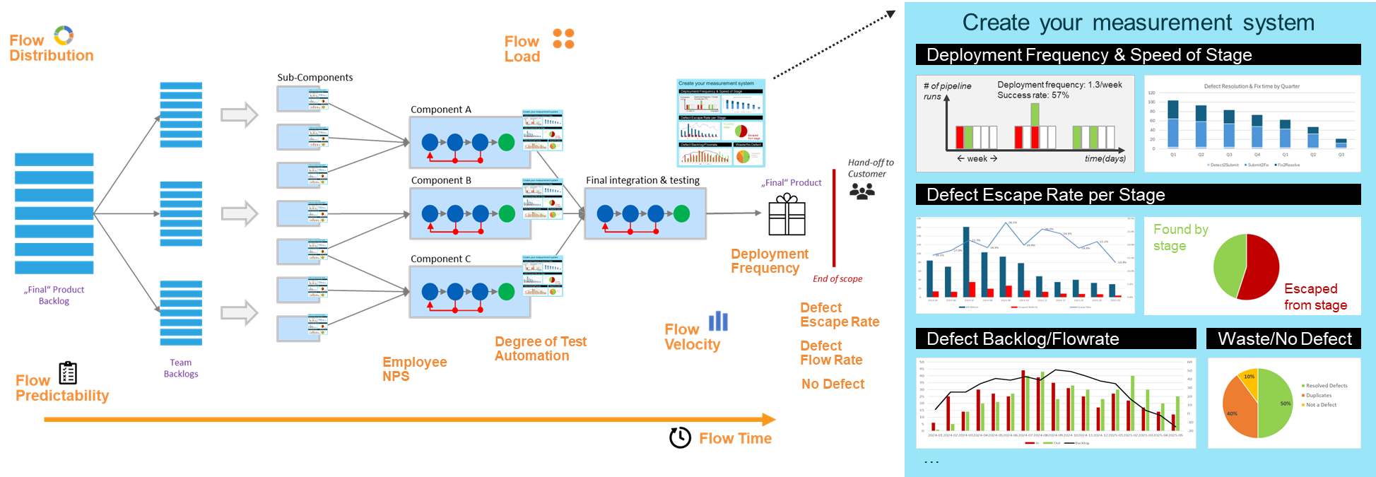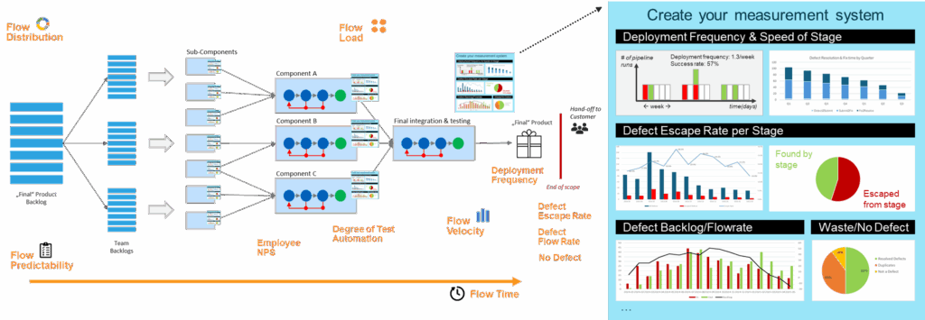 An effective measurement system must deliver insights into how performance evolves over time and provide dashboards and analysis tools that enable teams to explore, validate, and interpret the underlying data. The picture below shows examples of measures used within a value stream.