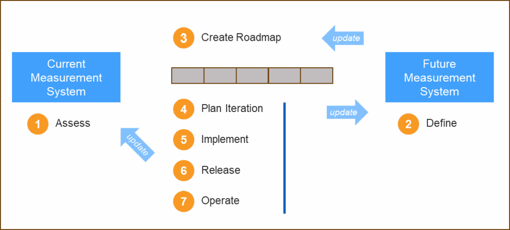 Building a measurement system is much like developing a product – in this case, the product is the measurement system itself. We begin by (1) assessing the current system to understand what already exists, then (2) define the desired future system. This future system must clearly specify what to measure and include the necessary tools and infrastructure to collect, calculate, and visualize the resulting insights. Based on this, we (3) create a roadmap and (4) plan the first iteration to move from the current state toward the future state. Next, we (5) implement, (6) release, and (7) operate the updated system – continuously collecting feedback and insights to refine the roadmap and plan subsequent iterations.
