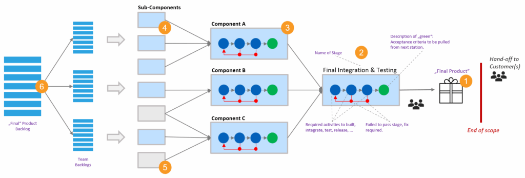 6 – Backlogs: New feature development and other changes are typically driven by backlogs. As products or systems grow in complexity, this often results in a cascade of interconnected backlogs.10 In more traditional development processes, this phase may look quite different, relying instead on formal requirements and specifications. For this example, we focus on a value stream centered around backlogs. Since detailed backlogs are usually team-specific, we’ve represented them here using broad arrows to indicate assignment to the components11. A real-world example will follow, providing more detail.